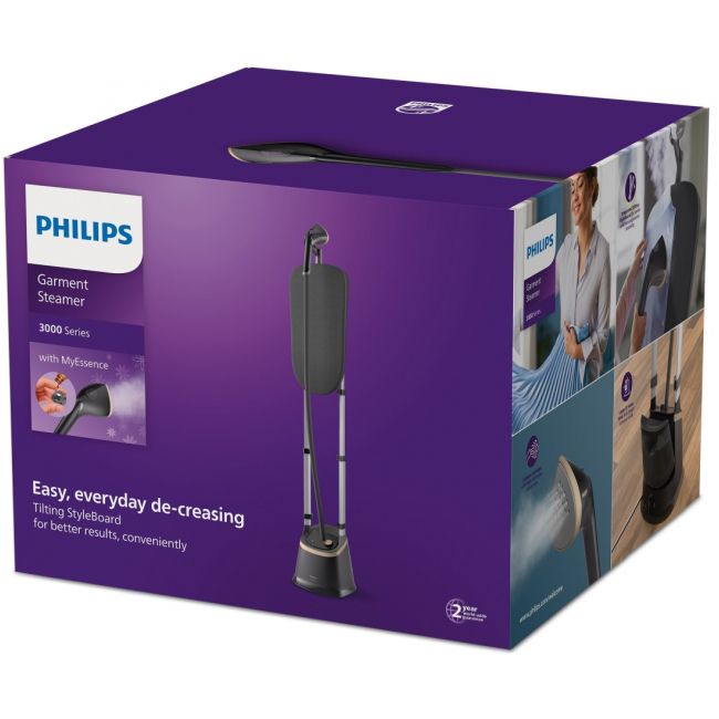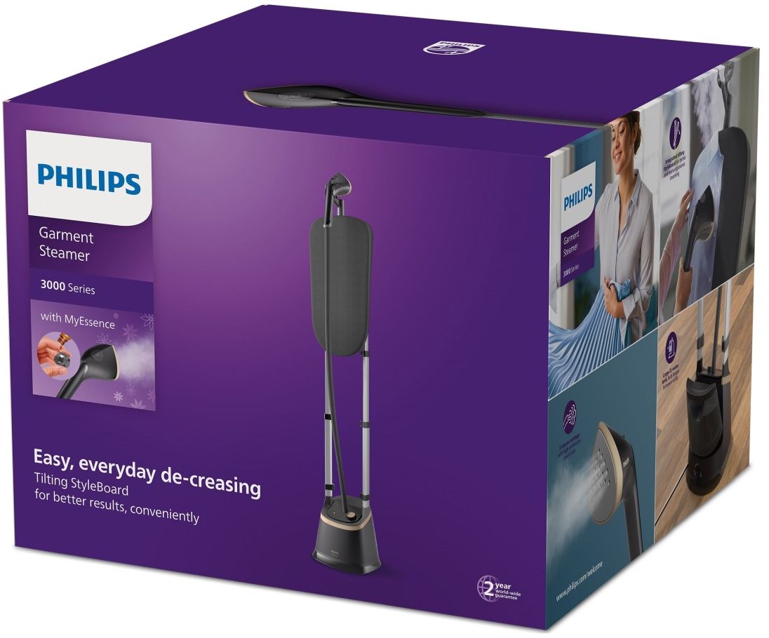 Prasuj szybciej dzięki steamerowi stojącemu serii 3000 firmy Philips wyposażonemu w zintegrowaną deskę oraz duży, ostro zakończony moduł steamera. Zdezynfekuj swoją szafę i odśwież swoje ubrania za pomocą nasadki zapachowej MyEssence.