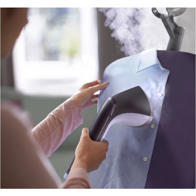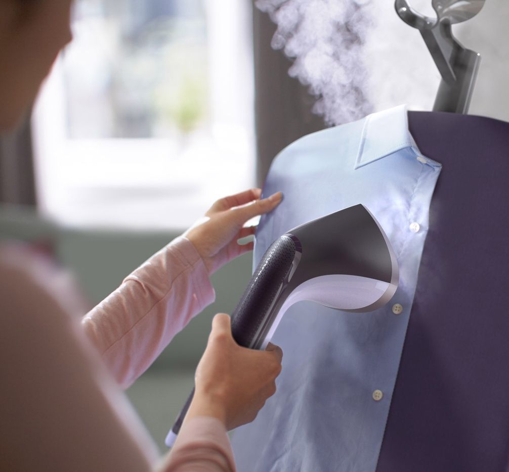 Perfekcyjna precyzja: innowacyjna głowica naszego steamera jest wyposażona w dużą stopę i precyzyjną końcówkę, co ułatwia prasowanie okolic kołnierzyków oraz przestrzeni między guzikami.