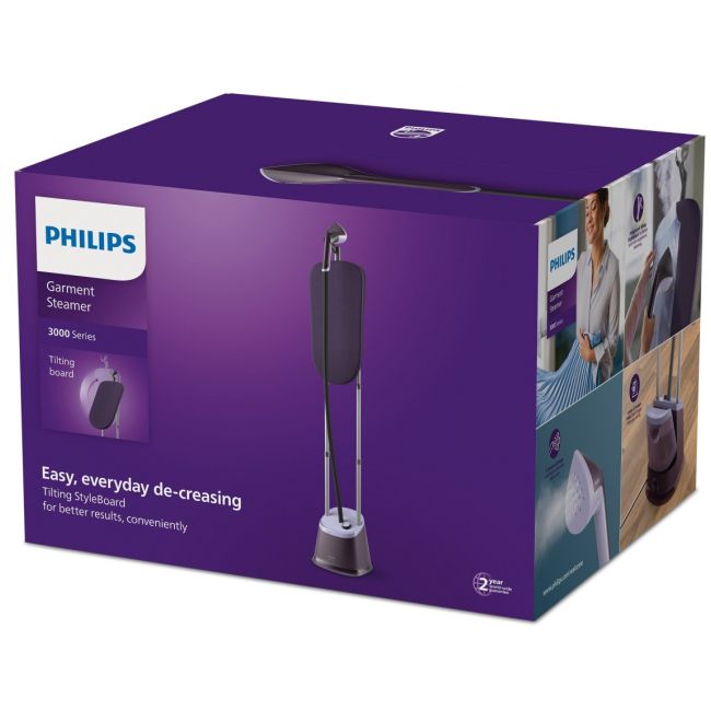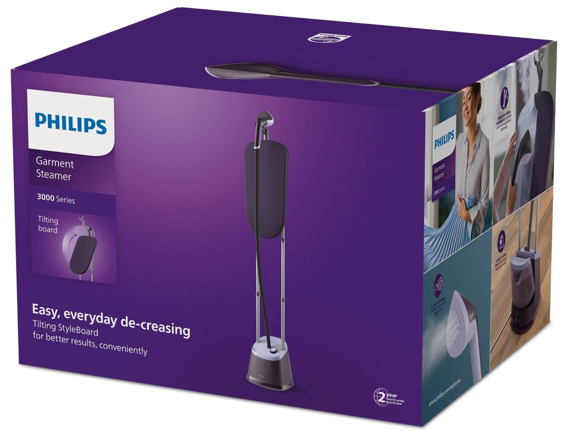 Prasuj szybciej dzięki steamerowi stojącemu serii 3000 firmy Philips, aby mieć więcej czasu na radość ze swoich ubrań. Zintegrowana i solidna deska StyleBoard oraz duża, ostro zakończona głowica steamera pozwalają z łatwością usuwać każde zagniecenia.