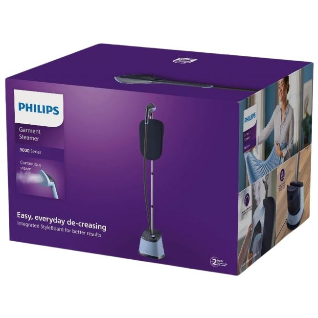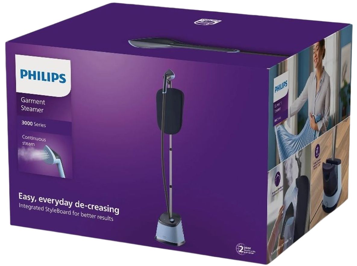 Prasuj szybciej dzięki steamerowi stojącemu serii 3000 firmy Philips, aby mieć więcej czasu na radość ze swoich ubrań. Zintegrowana i solidna deska StyleBoard oraz duża, ostro zakończona głowica steamera pozwalają z łatwością usuwać każde zagniecenia.