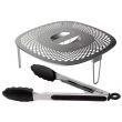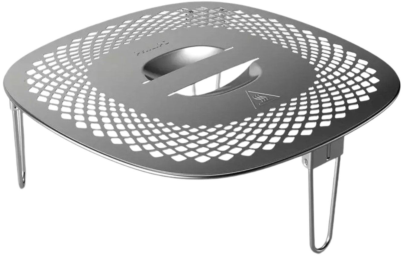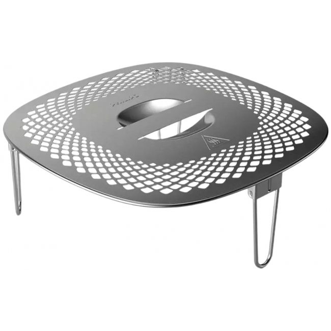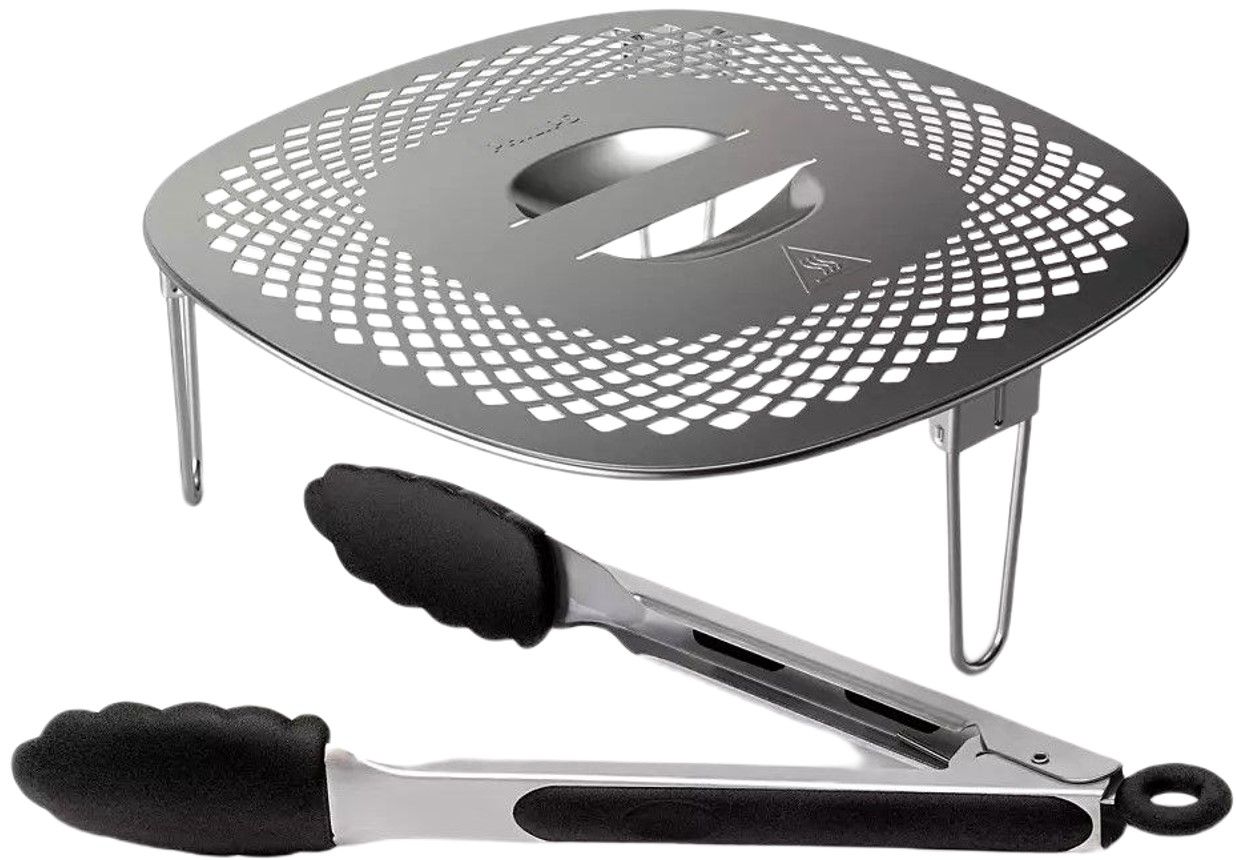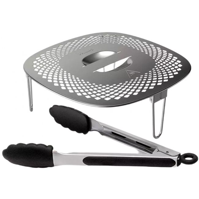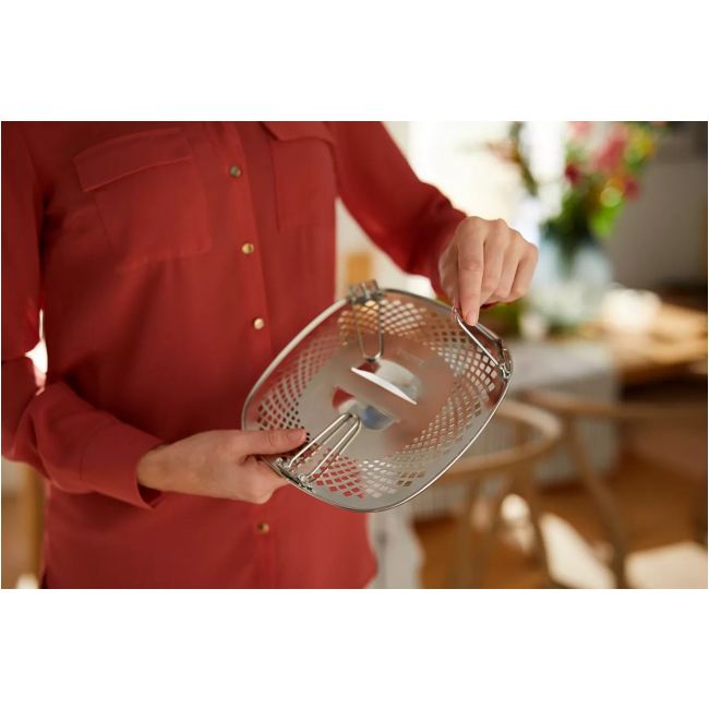 Zarówno przykrywka, jak i szczypce mogą być myte w zmywarce. Dla ułatwienia przechowywania, nóżki przykrywki są składane.