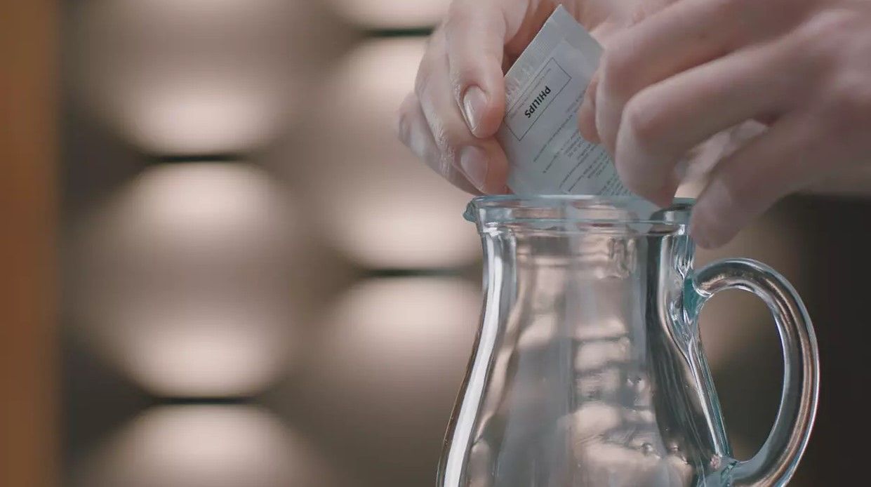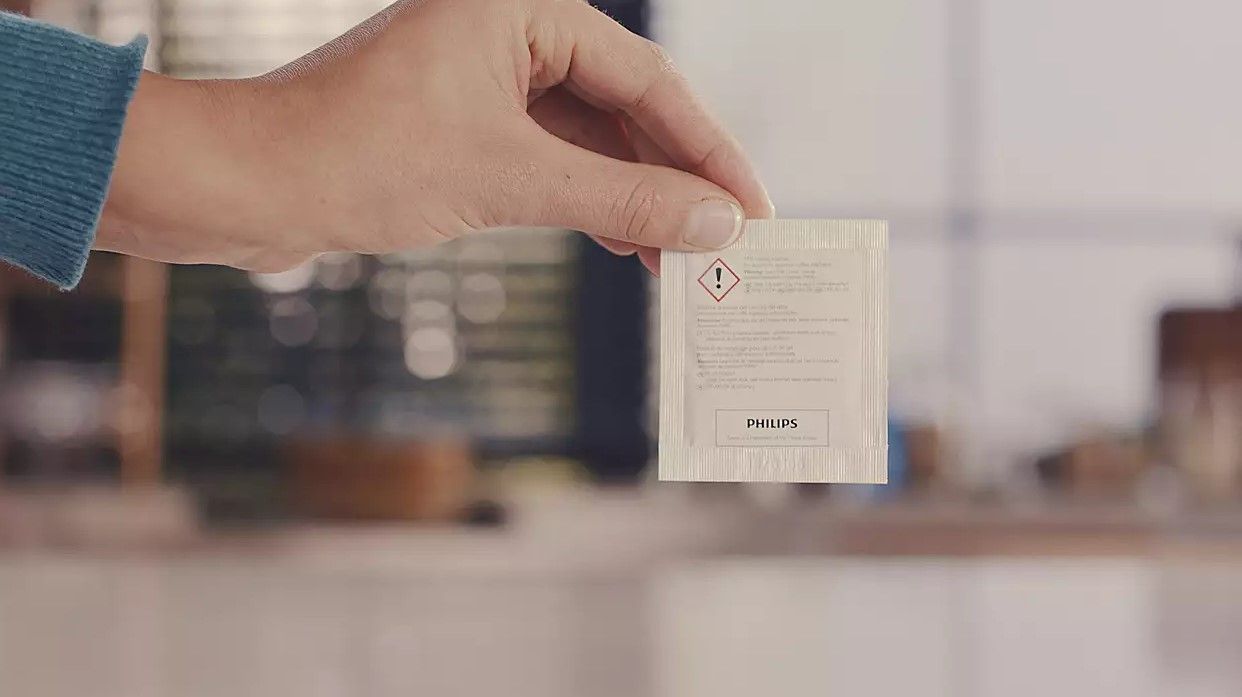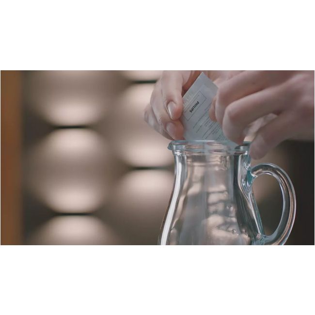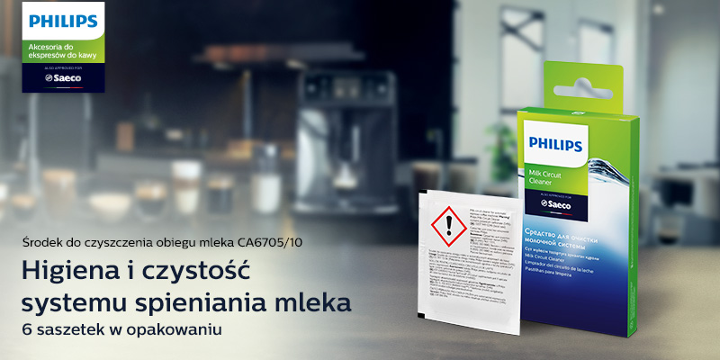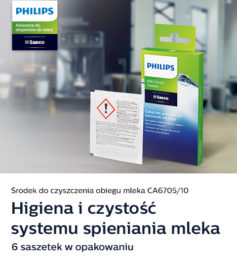 Aksamitnie mleczna pianka idealnie podkreśla smak białej kawy. Niestety resztki mleka, pozostające w systemie spieniania, nieusuwane mogą psuć się oraz zapychać przewody. Dlatego z czasem mleczna pianka traci na swej puszystości, a cały system może przestać działać. Aby tego uniknąć, zalecamy stosowanie środka do czyszczenia Philips przynajmniej raz w miesiącu. Wystarczy wsypać zawartość saszetki do dzbanka z wodą (500 ml) lub karafki na mleko i postępować zgodnie z poleceniami urządzenia*. Jedno opakowanie zawiera sześć saszetek produktu.