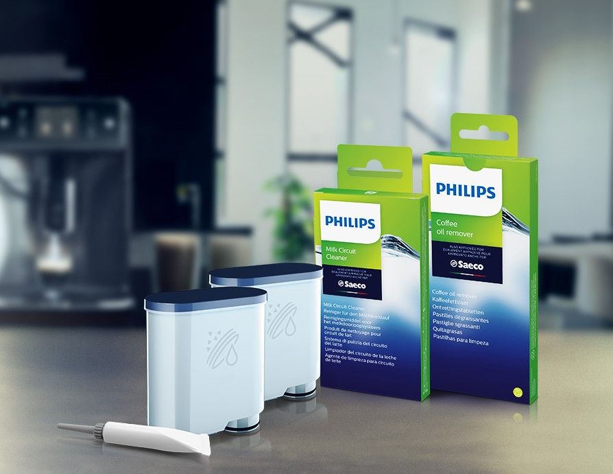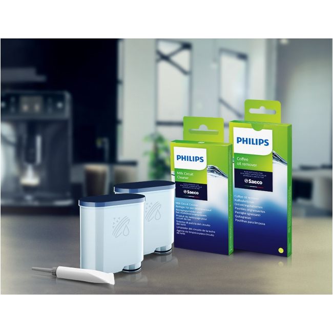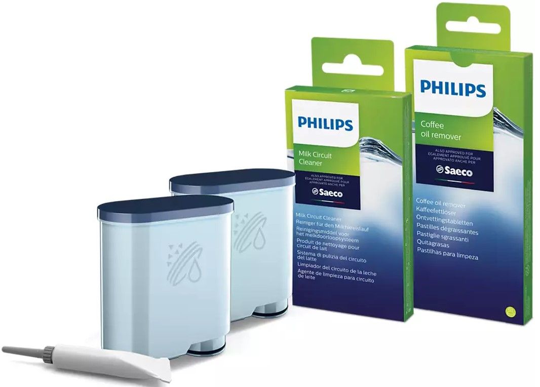 Tabletki odtłuszczające Philips oraz proszek do czyszczenia obiegu mleka zapewniają sprawne działanie ekspresu i doskonały smak kawy. Zalecamy używanie cyklu czyszczenia raz w miesiącu.
