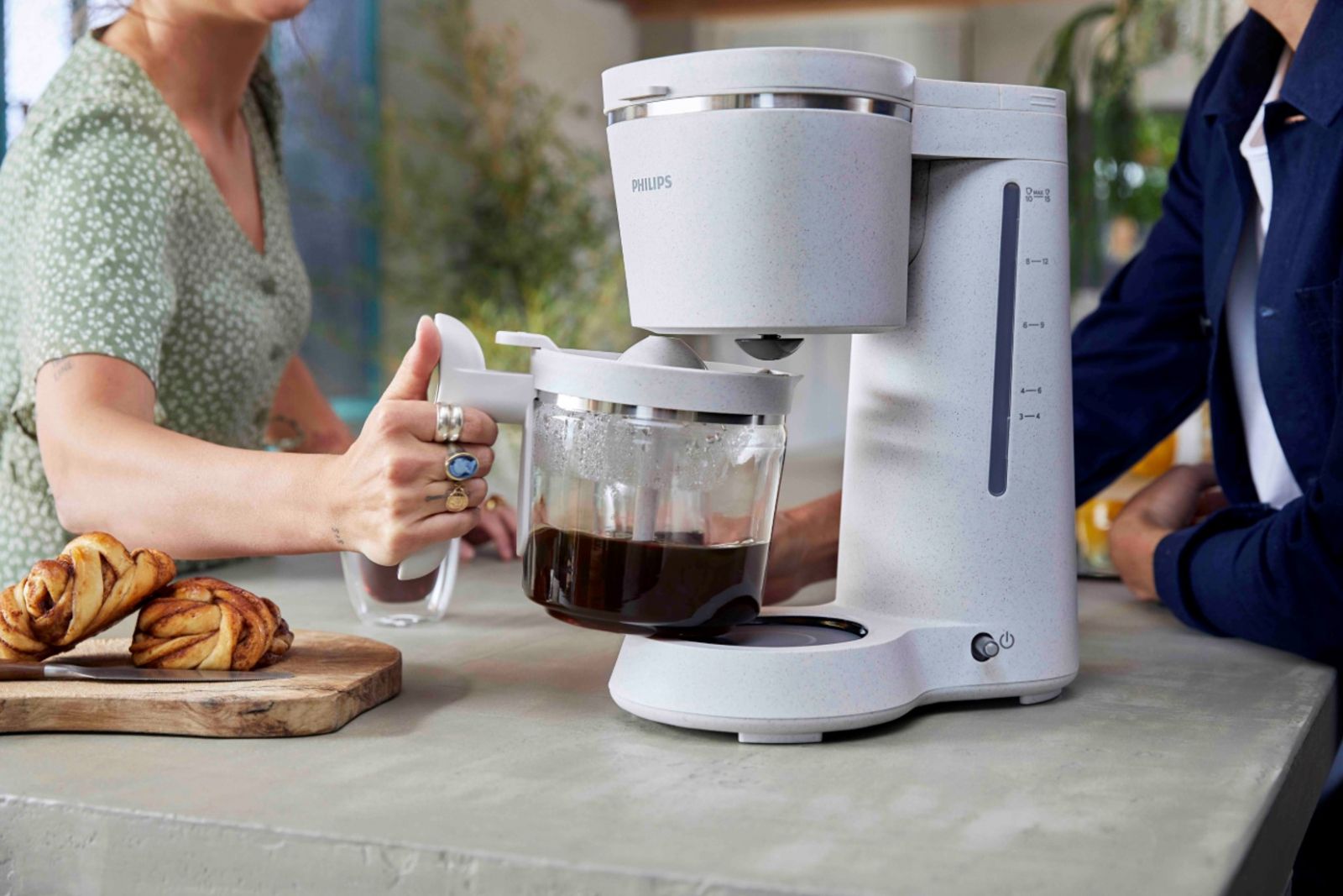 Elegancki ekspres do kawy o wysokiej mocy pozwoli Ci co rano przygotować pyszną, aromatyczną kawę. Wykonany całkowicie z bioplastiku** i wyposażony w funkcje oszczędzania energii pozwala zrobić kolejny mały krok w kierunku bardziej ekologicznej przyszłości.